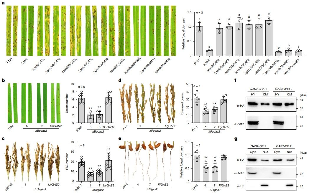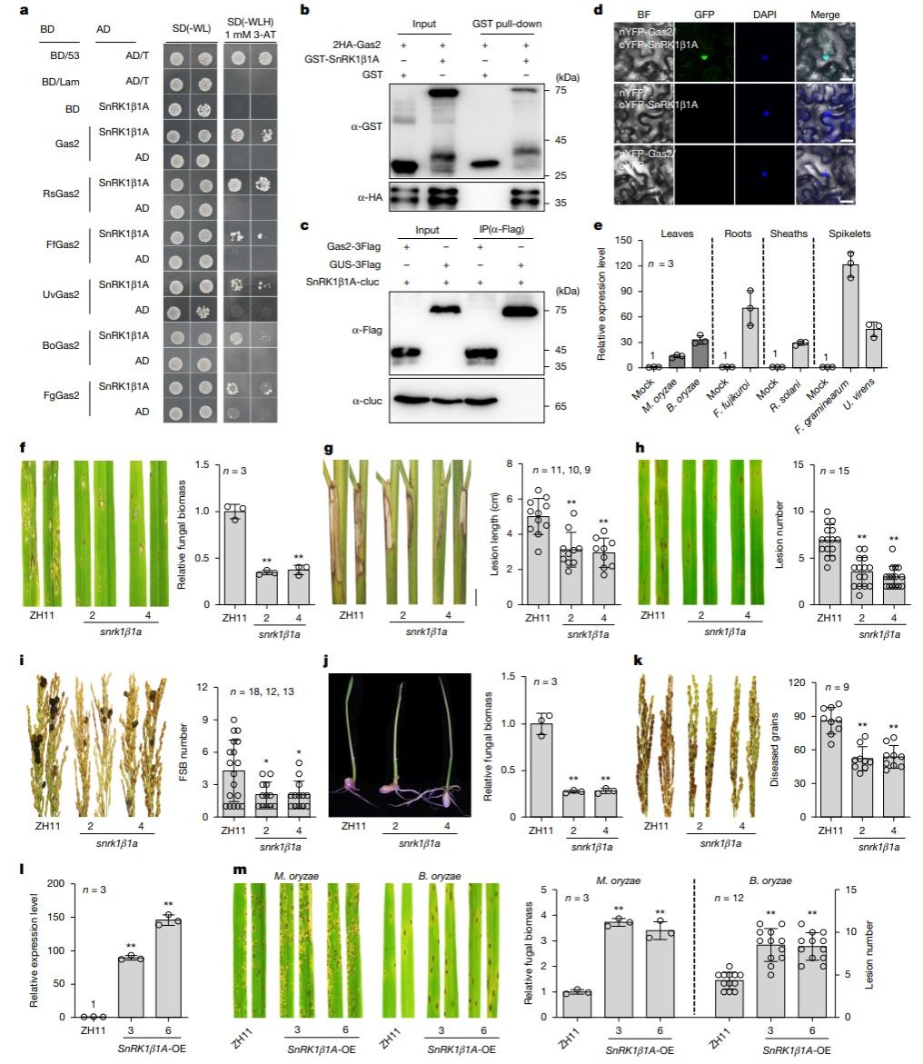 该团队发现,水稻的稻瘟病菌、纹枯病菌、稻曲病菌、胡麻叶斑病菌、恶苗病菌和穗腐病菌等共同进化出了一个三维结构相似、功能保守的胞内效应蛋白Gas2。通过分子功能研究,他们还发现该效应蛋白靶向水稻的SnRK1β1A蛋白,促进病菌对水稻的侵染;并确定Gas2是一个具有核定位功能的效应蛋白,通过与水稻SnRK1β1A的互作,减少SnRK1β1A的泛素化降解、并引导SnRK1β1A进入水稻细胞核。
