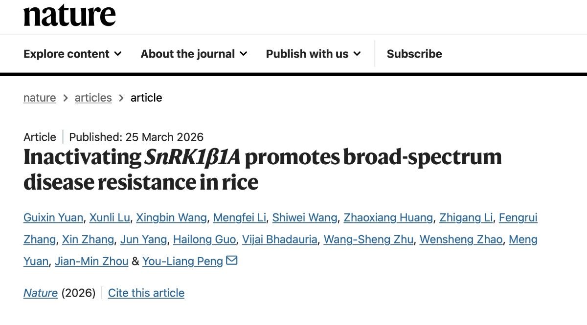 3月26日,农林生物安全全国重点实验室彭友良团队在国际学术期刊《自然》(Nature)上发表了题为《敲除SnRK1β1A基因促进水稻广谱抗病性》(Inactivating SnRK1β1A promotes broad-spectrum disease resistance in rice )的研究论文。该团队发现:水稻多种病原真菌共进化出了一个保守的效应蛋白Gas2,共同靶向水稻诱导性感病蛋白SnRK1β1A,敲除该蛋白的编码基因可增强水稻的广谱抗病性。该研究对于其它作物的广谱抗病性育种亦有借鉴意义。