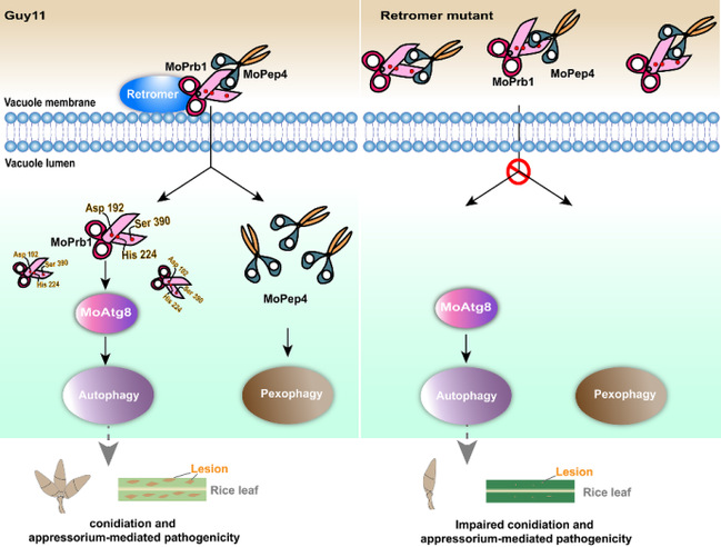 稻瘟病是严重威胁全球粮食安全的重大病害,其致病机制一直是研究热点。液泡接收来自内吞和自噬途径的物质,并将其降解,从而实现营养物质的循环利用,而囊泡逆向转运复合体(retromer)则负责将特定货物从内体分拣至反式高尔基网络或质膜,从而避免不必要的液泡降解。然而,retromer在自噬底物降解过程中是否参与调控液泡蛋白水解系统仍不清楚。本研究发现,在稻瘟病菌中,retromer复合体通过确保液泡蛋白酶进入液泡腔来调控巨自噬和微自噬。作为retromer的核心亚基,MoVps35负责将丝氨酸蛋白酶MoPrb1从内体转运至液泡腔。缺失MoVPS35或其他retromer组分都会阻碍MoPrb1-GFP进入液泡腔。ΔMoprb1突变体表现出与retromer突变株类似的缺陷,包括自噬依赖的分生孢子形成及附着胞介导的侵染致病缺陷。此外,MoPrb1的关键催化残基(Asp192、His224和Ser390)发生突变时,自噬通量显著下降。进一步研究发现,MoVps35还可通过MoPrb1与另一种天冬氨酸蛋白酶MoPep4相互作用。缺失MoPEP4会导致微自噬(如过氧化物酶体自噬)的异常。总体而言,本研究揭示了稻瘟病菌retromer复合体通过介导多种液泡蛋白酶向液泡腔的定向转运,精确调控不同自噬底物的降解过程,该机制对稻瘟病菌的正常生长发育及侵染致病至关重要。