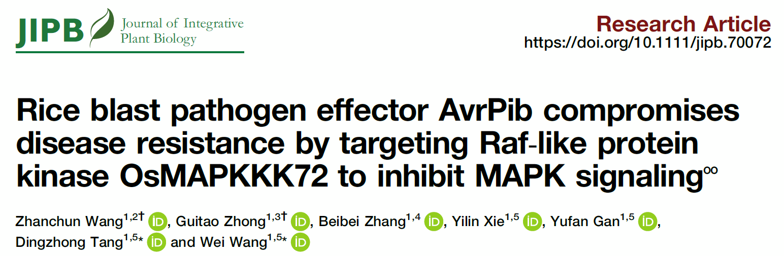 近日,我室唐定中教授团队在《植物学报(英文版)》JIPB上发表题为“Rice blast pathogen effector AvrPib compromises disease resistance by targeting Raf-like protein kinase OsMAPKKK72 to inhibit MAPK signaling”(稻瘟菌效应因子AvrPib靶标Raf类激酶OsMAPKKK72抑制MAPK和水稻抗病)的研究论文。该研究发现一个水稻Raf类MAPKKK蛋白激酶OsMAPKKK72作为支架蛋白在稻瘟病抗性中发挥关键作用,并揭示稻瘟菌效应因子AvrPib通过靶标OsMAPKKK72,抑制OsMAPKKK72与OsMKK9的相互作用,进而干扰MAPK信号并抑制水稻稻瘟病抗性的分子机制。