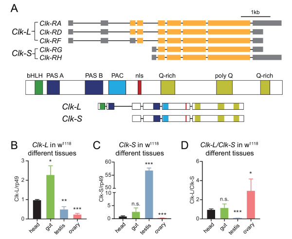 生物钟是生物体内一种内在的计时机制,协调着生理和行为以适应昼夜变化。然而,核心时钟元件在外周组织(如生殖器官)中如何被调整以执行组织特异性功能有待研究。该研究团队首先发现果蝇Clk存在长异构体(Clk-L)和短异构体(Clk-S),二者在生殖组织中表达模式具有明显差异。Clk-S在睾丸中高度富集,而Clk-L在头部和肠道中表达较高,卵巢中两者表达均较低。这种异构体的组织特异性分布是调节生殖组织昼夜节律环路的关键。