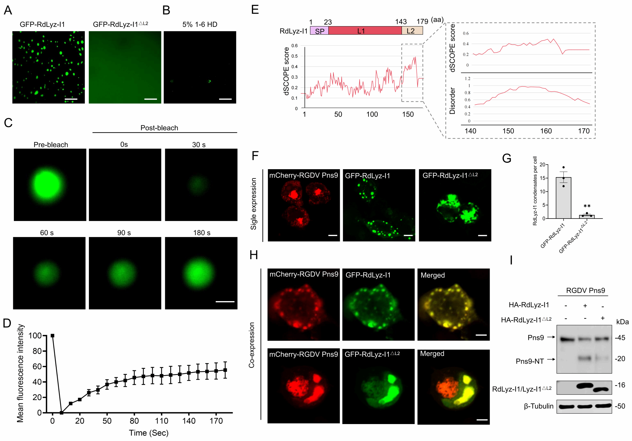 图2. 叶蝉Lyz-I1形成的相分离凝聚体增强其切割病毒蛋白的效率