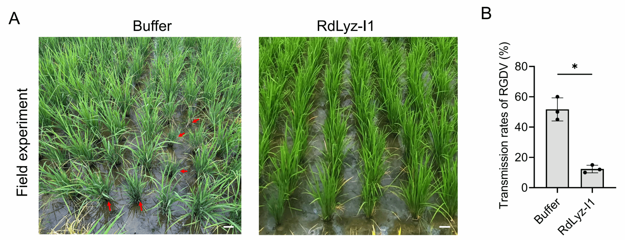 在应用层面,该研究也展现了田间防控场景。通过根部浸泡外源施加的Lyz-I1,可被水稻吸收并转运至叶片,有效切割Pns9蛋白,降低病毒载量并减轻病害。田间试验中,该处理显著降低了RGDV发病率。此外,Lyz-I1还能激活水稻自身免疫系统,实现“清除病毒”与“诱导植物免疫”的双重防护。