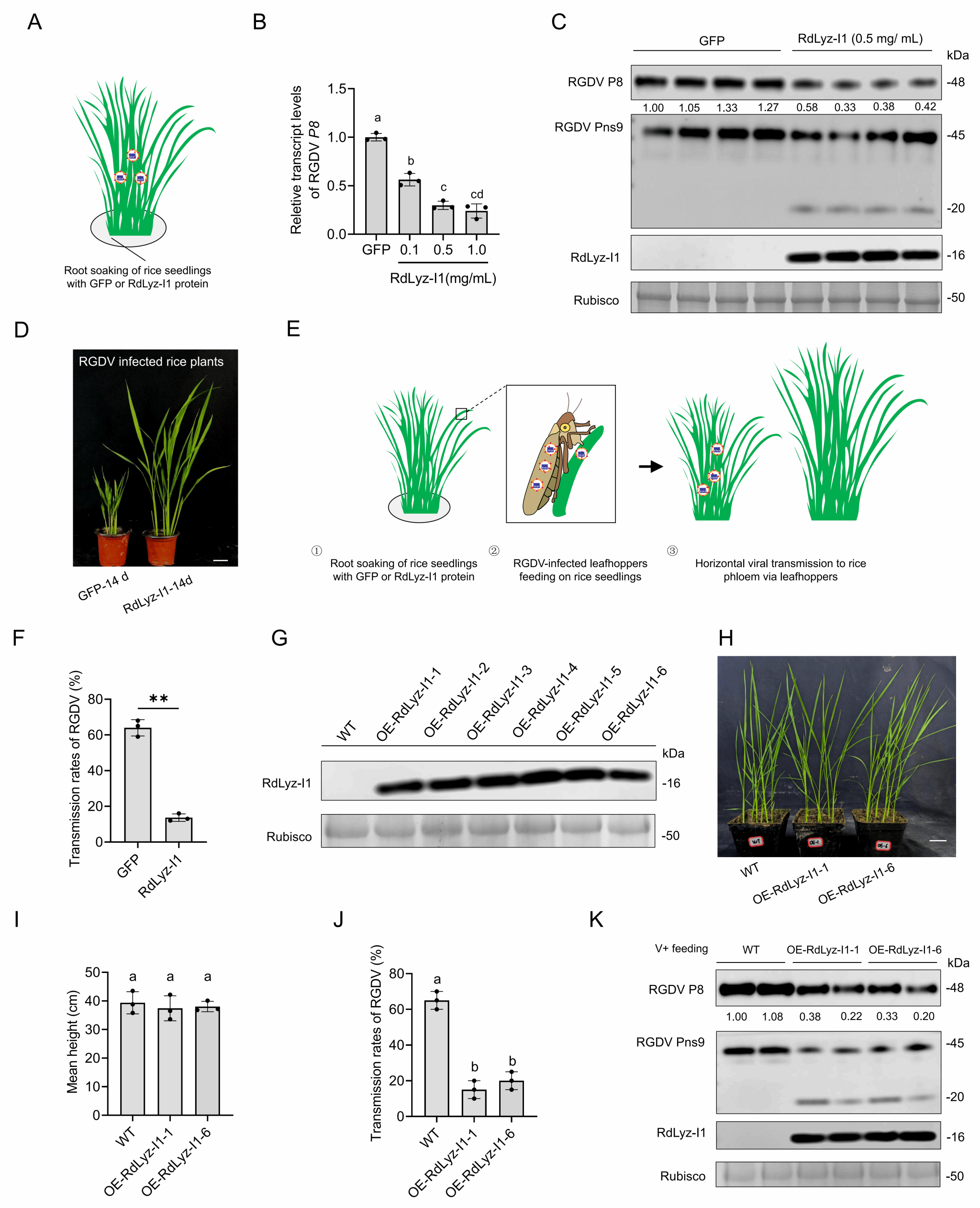图3. 叶蝉Lyz-I1抑制RGDV侵染水稻