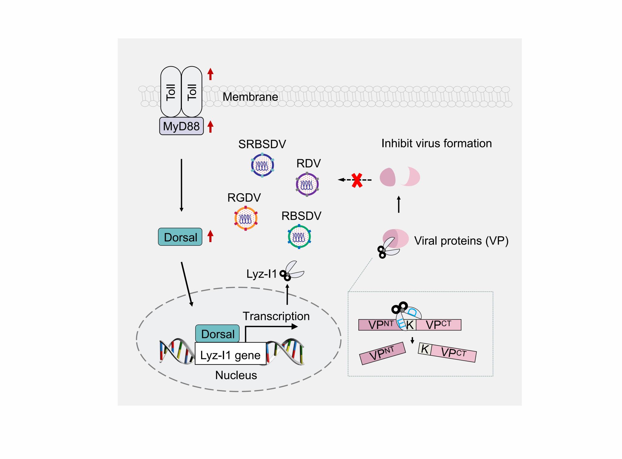 自亚历山大·弗莱明发现溶菌酶以来,科学界普遍认为其功能依赖于保守的“催化双元体”切割细菌细胞壁中的糖苷键。然而,魏太云研究员团队在对水稻瘤矮病毒(RGDV)及虫媒叶蝉的研究中发现,一种受Toll信号通路调控的I型溶菌酶(Lyz-I1)在叶蝉抗病毒免疫中发挥核心作用。